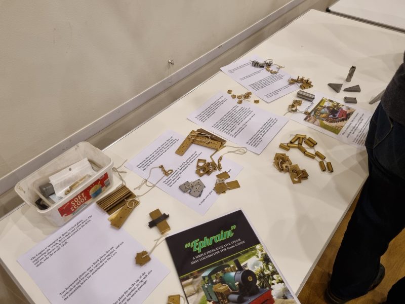Tony had laid out on a separate table the parts he had so far machined up which would be contributing to the various builds. Then Tony showed us a video of the loco in action on 45mm gauge track. Very interesting as I had not realised the boiler is off-set to accommodate the side mounted 3-cylinder steam plant. It was explained that most locos would start by assembling the frames, but Shay locos drive a pair of bogies and so are quite different.