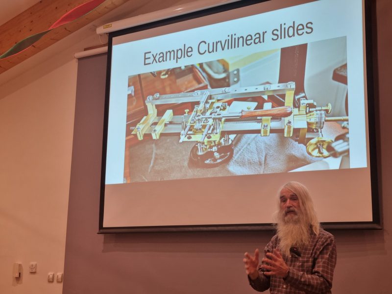 The evening was to close with a device that could be 'clamped' on to a lathe called a curvilinear slide. I was 'interested' and the device was very complex but apart from seeing the intricate wooden patterns it could make, its operation was a mystery to me.